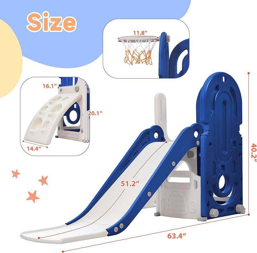 [兒童遊樂場 5 合 1] 清新造型設計! 精緻可愛的獨立式鞦韆和滑梯組,適合幼兒,有三個功能部分:1 個滑梯、1 個攀爬坡道、1 個鞦韆、1 個籃球圈和 1 個隱藏空間,可存放玩具。 這款套組讓孩子們完全釋放他們有趣的自然,他們可以和朋友一起玩幾個小時!